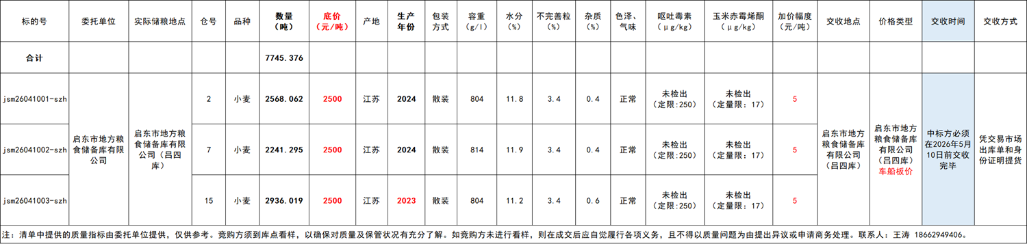 五、交割事項:中標方成交后憑市場出庫單和身份證明到賣方指定庫點提貨,交割完成后買賣雙方憑雙方確認單到交易市場退保證金(保證金不沖抵貨款,待合同履約結束后統(tǒng)一釋放)。中標方必須在2026年5月10日前交收完畢,如遇不可抗力(雨季等)經雙方協(xié)商解決。中標方一旦開倉提貨,須盡快提貨完畢,否則出現(xiàn)質量問題由中標方承擔。