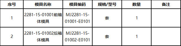 6. 項目概況:山推股份有限公司傳動公司鑄鐵車間,HST2228平地機變速箱前箱體和后箱體模具制作。項目包括零件圖號為2281-15-01001的前箱體整套模具制作和零件圖號為2281-15-01002的后箱體的整套模具制作。如下表所示:
