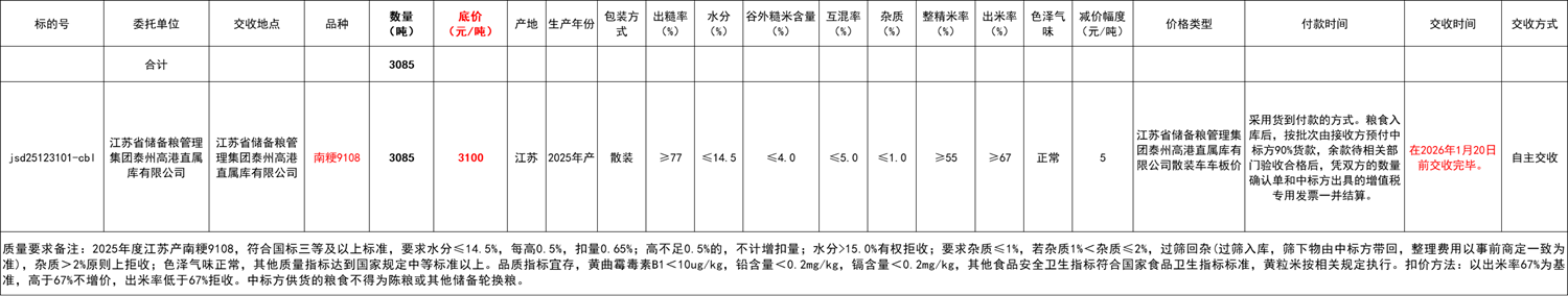 2.品質(zhì)要求:2025年度江蘇產(chǎn)南粳9108,符合國標(biāo)三等及以上標(biāo)準,要求水分≤14.5%,每高0.5%,扣量0.65%;高不足0.5%的,不計增扣量;水分>15.0%有權(quán)拒收;要求雜質(zhì)≤1%,若雜質(zhì)1%<雜質(zhì)≤2%,過篩回雜(過篩入庫,篩下物由中標(biāo)方帶回,整理費用以事前商定一致為準),雜質(zhì)>2%原則上拒收;色澤氣味正常,其他質(zhì)量指標(biāo)達到國家規(guī)定中等標(biāo)準以上。品質(zhì)指標(biāo)宜存,黃曲霉毒素B1<10ug/kg,鉛含量<0.2mg/kg,鎘含量<0.2mg/kg,其他食品安全衛(wèi)生指標(biāo)符合國家食品衛(wèi)生指標(biāo)標(biāo)準,黃粒米按相關(guān)規(guī)定執(zhí)行。扣價方法:以出米率67%為基準,高于67%不增價,出米率低于67%拒收。中標(biāo)方供貨的糧食不得為陳糧或其他儲備輪換糧。