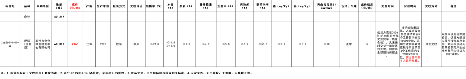 交易價格:采購方存糧點車船板價格。應(yīng)價起點數(shù)量為每個標(biāo)的的全部數(shù)量。起拍價2960元/噸,競拍減價幅度5元/噸,向中標(biāo)方收取成交金額2‰作為手續(xù)費。