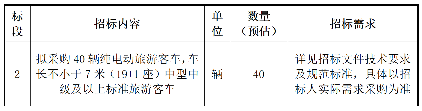 2.1招標范圍:擬計劃40輛純電動旅游客車(含融資成本、車價、送車費)。