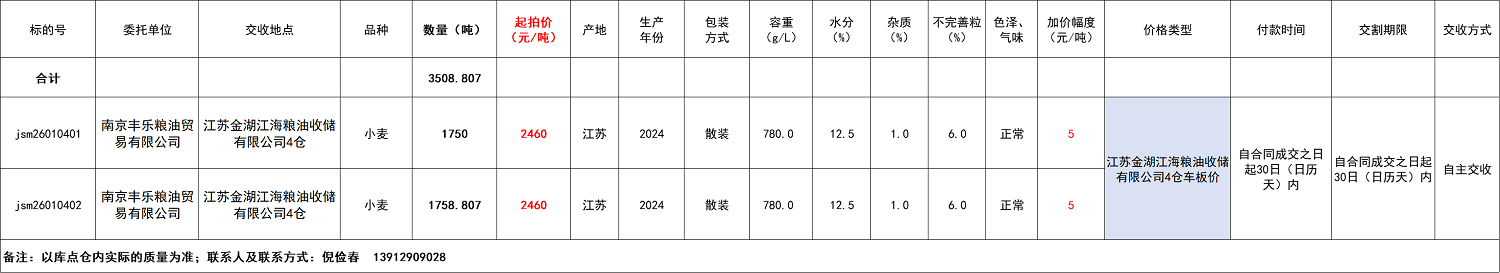 質(zhì)量:公告中提供的質(zhì)量指標(biāo)由委托單位提供,僅供參考。競購方須到庫點(diǎn)看樣(看樣時間需提前預(yù)約,聯(lián)系人:倪經(jīng)理 ******),以確保對質(zhì)量及保管狀況有充分了解。如競購方未進(jìn)行看樣,則在成交后應(yīng)自覺履行各項(xiàng)義務(wù),且不得以質(zhì)量問題為由提出異議或申請商務(wù)處理。