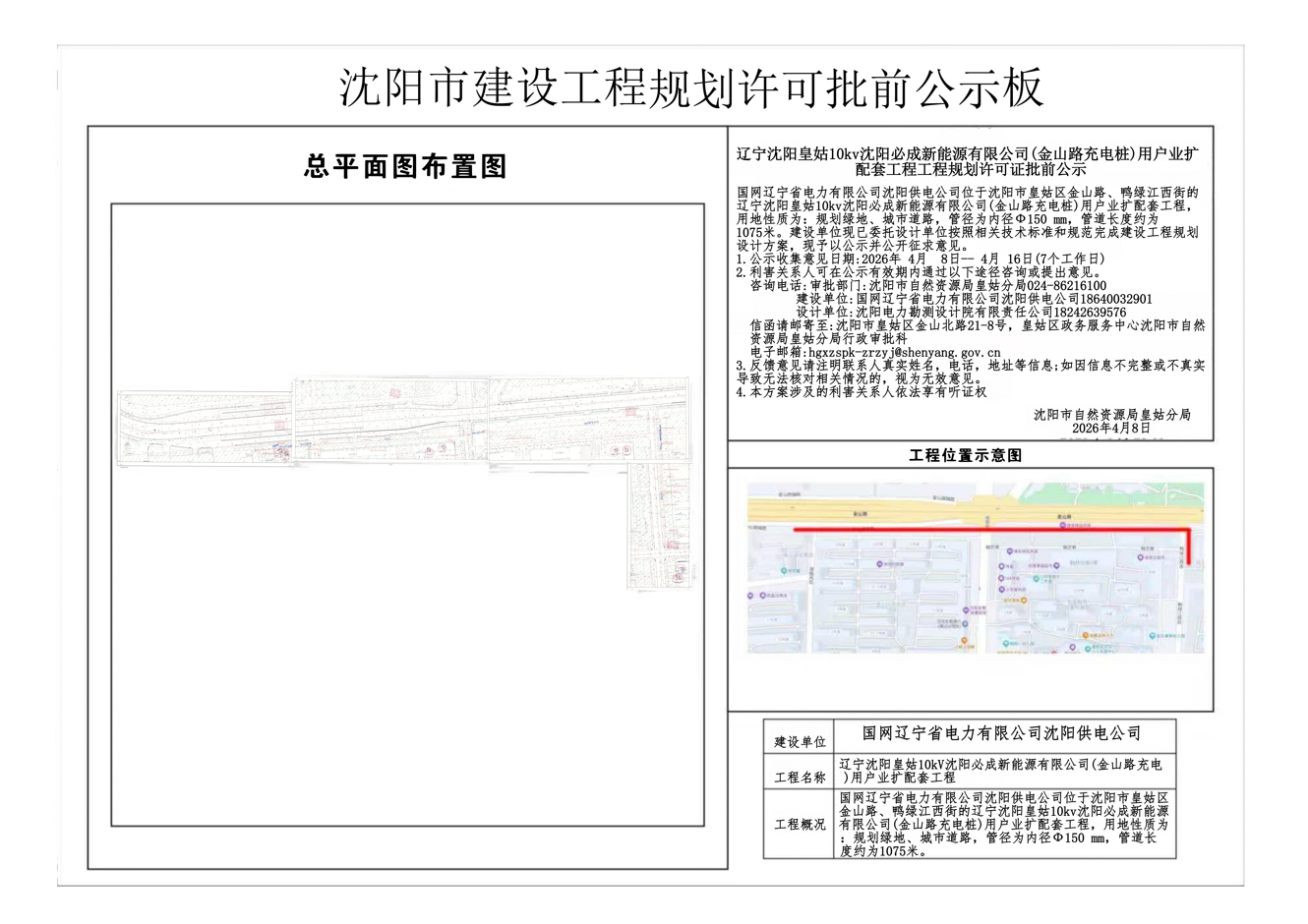 ******有限公司沈陽供電公司位于沈陽市皇姑區(qū)金山路、鴨綠江西街的遼寧沈陽皇姑******有限公司(金山路充電樁)用戶業(yè)擴配套工程,用地性質(zhì)為:規(guī)劃綠地、城市道路,管徑為內(nèi)徑Ф150 mm,管道長度約為1075米。建設單位現(xiàn)已委托設計單位按照相關技術標準和規(guī)范完成建設工程規(guī)劃設計方案,現(xiàn)予以公示并公開征求意見。