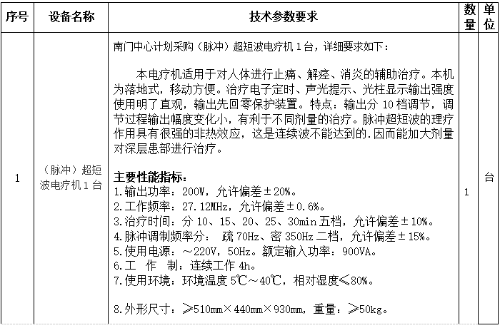 ******服務(wù)中心)擬采購(脈沖)超短波電療機1臺,邀請具有相應(yīng)資質(zhì)的供應(yīng)商參加院內(nèi)詢價。
